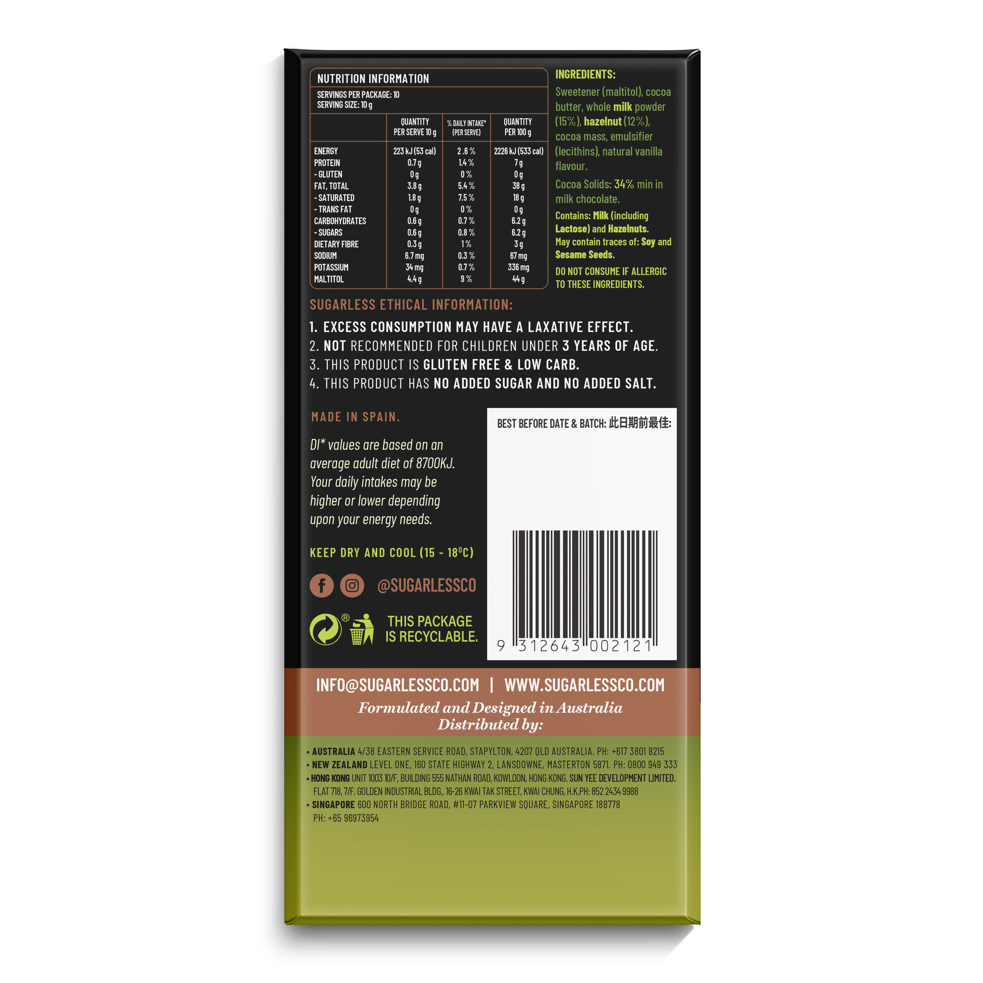 Ingredients: Sweetener (maltitol), cocoa butter, whole milk powder (15%), hazelnut (12%), cocoa mass, emulsifier (lecithins), natural vanilla flavour.