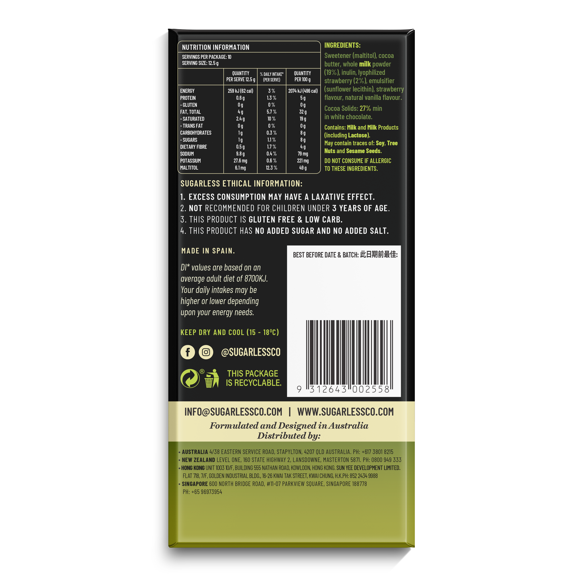 Ingredients: Sweetener (maltitol), cocoa butter, whole milk powder (19%), inulin, lyophilized strawberry (2%), emulsifier (sunflower lecithin), strawberry flavour, natural vanilla flavour.